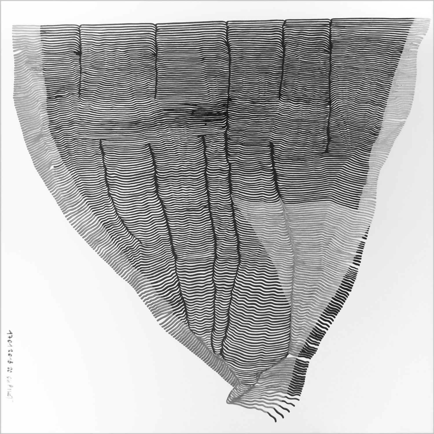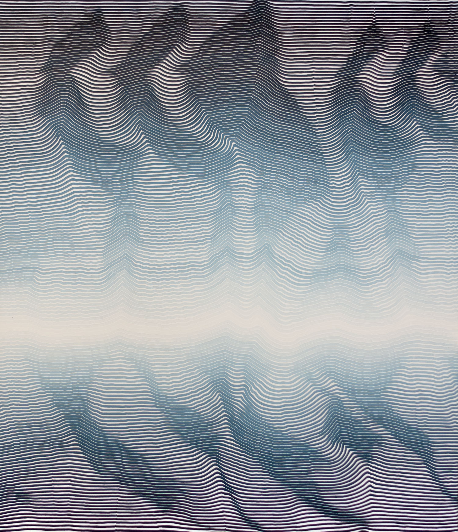Now is gone, signifie maintenant est révolu. Maintenant se transforme en permanence avec l’écoulement du temps. Dans ce travail, j’interprète la notion du temps, à travers des images intuitives construites par l’espace. La toile d’abord est peinte en blanc, puis je commence au bord de la toile et au pinceau, à main peindre à main levée une ligne horizontale. Puis je peins une seconde ligne en veillant à ce que l’espace blanc entre les deux n’excède pas la largeur du pinceau. Ainsi par contrastes, les espaces blanc se créent, varient et deviennent acteurs eux même. Lorsque je trace un trait, à chaque fois que je reprends de la peinture, il y a le concentré de la peinture que j’étire , et à chaque concentré il y a un point qui se forme, et ces points les uns sous les autres créent une ligne imaginaires. Des zones de reliefs et de vibrations naissent d’un total hasard. Et en fait il y a un mécanisme qui se met en place, qui lui, devient systématique, et c’est là que je commence un travail. En fonction des couleurs, le rythme n’est pas le même. Les bleus turquoises sont complètement différents que les bleus outremer ou les rouges Brueghel. Ce qui m’intéresse c’est vraiment ce qui va se passe, l’invisible qui se tisse pendant que je peins, ce qui va advenir, ce que je vais découvrir quand la toile sera terminée. Vivre c’est se consacrer à son instant présent, c’est comprendre qu’il faut se consacrer à ce que l’on est tout de suite collaborer ainsi à ce qui adviendra..